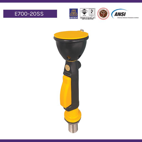 A handheld single eye spray unit designed for emergency cleansing of eyes and face. It comes with a stainless steel braided hose and a simple switch to lock handle when in use. High-quality durable plastic spray head gives a soft spray for cleansing of eyes and face. This unit also includes a protective spray head cover.