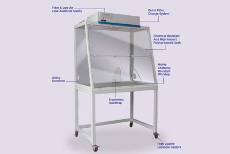 Mobile and highly functional ductless fume hood. Equipped with NFX tested filtration system, our ductless fume hood comes with high performance activated carbon filters designed to remove chemical fumes effectively.
